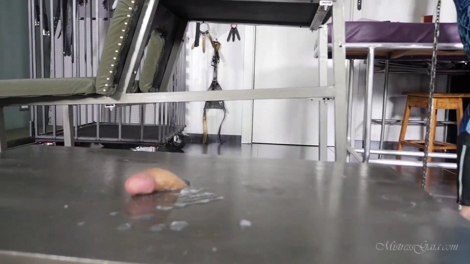I'm in a good mood today, I'm just back from the gym and my slave has been patiently waiting for me. I left him on the floor with his cock in the cock table. Since he's been quite obedient lately, I told him i would have a little surprise for him on my return. I begin to tease him